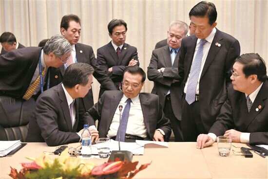 ■2014年12月16日,李克强同志在贝尔格莱德出席第三次中国-中东欧国家领导人会晤。这是会谈间隙,他与随行部长进行会商。新华社发