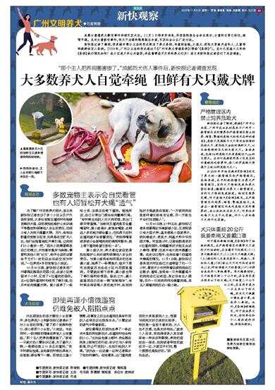 为了解广州目前养犬现状,连日来新快报记者走访了多个小区以及户外场所发现,大多处宠物主遛狗时均能做到牵好犬绳,自觉承担起维护公共环境干净整洁和保障他人安全的责任,但很少有人为狗只佩戴犬牌。另外,有相当数量的宠物主坦言,如果是在空旷无人处,他们会短暂地松开牵引绳,让狗狗们小小撒欢一把,“因为小狗需要释放自己的精力,天性喜欢撒欢与奔跑,需要和其他小狗‘社交’,条件合适的话要给予它们一定的自由活动空间与时间。”一位养狗4年的宠物主小庞说。