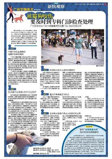 广州市卫健委提醒,市民应合法养犬,为宠物办理登记证;科学养犬,每年定时为爱犬进行疫苗注射;文明养犬,遛狗请牵好狗绳,建议外出佩戴嘴套,避让行人。市民要加强自我保护意识,不要随便招惹动物,不要打扰在进食、睡觉或看护幼崽的猫、狗,皮肤有伤口时也尽量不要与猫、狗接触。家长应教育小孩若被狗或其他动物咬伤、抓伤后要及时报告,并及时进行伤口处理和疫苗接种。