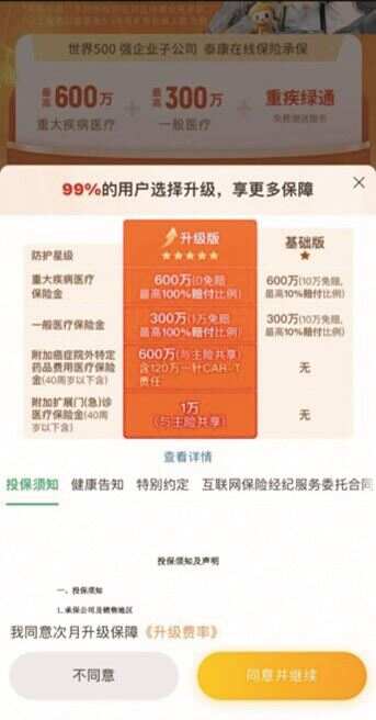 8月下旬,记者通过一条营销短信的链接投保了泰康在线的一款医疗险,该产品投保页面显示“99%的用户选择升级、享更多保障”。以重疾医疗保险金为例,基础版和升级版均为600万元,前者免赔额为10万元,最高赔付比例为10%,后者0免赔,最高赔付比例为100%。记者在投保的同时完成了升级,产品首月和次月保费分别为0.8元和43.5元,全年应缴纳479.3元。