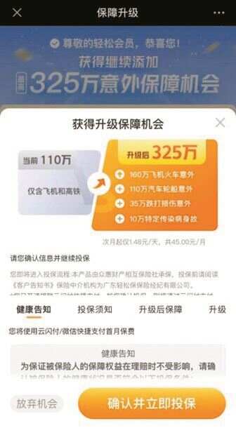 然而,目前仍有保险产品以升级保障为营销噱头。11月2日,新快报记者在“轻松保”旗下平台发现,该平台在售的3款医疗险、意外险、重疾险均在宣传页面注明升级前后的保障、保费差别,保费信息以较小的字体呈现。3款产品分别由泰康在线、众惠相互和利宝保险承保。以记者投保的基础版重疾险为例,每月保费为0.39元,总保额103.1万元,其中,重疾保险金和特疾保险金分别为1000元和20000元。升级后,次月起保费为20.58元/月,总保额升至343.3万元,包括增加重疾保障30万元等。