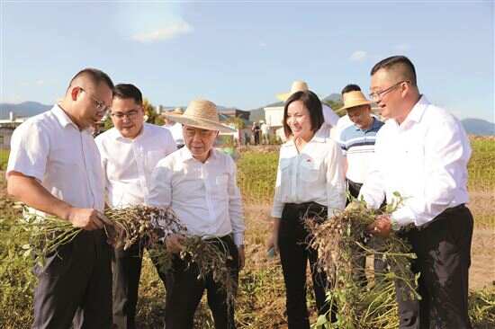 ■曾庆洪(左三)一行到东石镇花生与水稻产业共建示范基地调研。