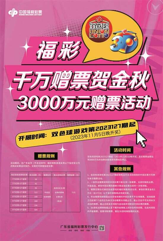新快报讯 记者陆妍思 通讯员莫冠婷报道 为回馈彩民对广东福彩事业的支持与厚爱,广东省福利彩票发行中心于福彩双色球游戏第23127期(11月2日晚开售,11月5日晚开奖)起,在全省范围内(不含深圳市)开展“千万赠票贺金秋”赠票营销活动,共将送出3000万元3D彩票。这是广东首次开展的购买双色球中奖送3D彩票的联动促销活动。