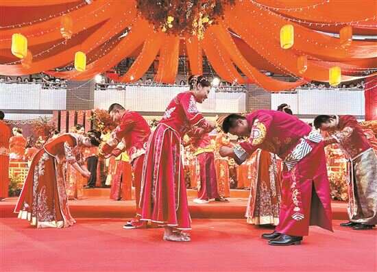 集体婚礼仪式隆重而浪漫,新人们身穿中式喜服,走红毯开启“幸福之门”。每对新人手中都牵着一条红线,寓意合二为一、永不分离;跨过火盆,寓意生活红红火火;跨过马鞍形状的檀香木,寓意岁岁保平安。新人们还进行了“三拜之礼”,“拜天地”“拜母校”“夫妻对拜”。从三拜之礼到合卺礼,从结发礼到执手盟誓,从接婚书到行拜谢之礼……重返校园的他们在传统仪式中感受到了母校真挚的祝福。