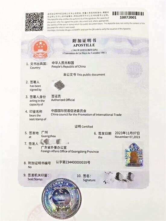 按照过往做法,中国同《公约》缔约国之间公文书跨境流转需要经过“外交外事部门认证+使领馆认证”的“双认证”程序。2023年3月8日中国加入《取消外国公文书认证要求的公约》。11月7日,《公约》在中国生效实施。此后,中国同《公约》缔约国将在《公约》框架下启用基于“附加证明书”(Apostille)的“一步式证明”新模式。