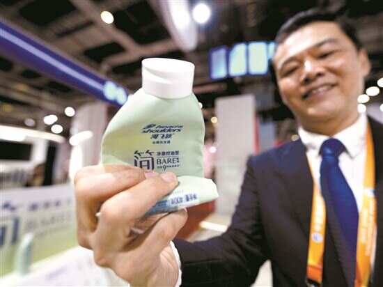 ■在宝洁展台,工作人员介绍在中国首次展出的一款新产品,可以将瓶身卷起来,用到空瓶不浪费。