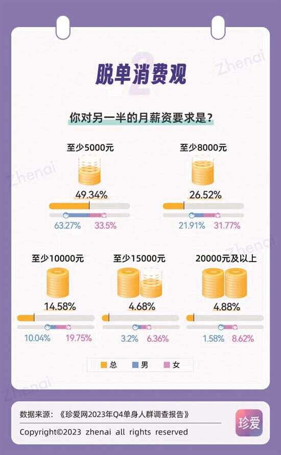 爱情里应该谈钱吗?坦率来说,经济条件对幸福感的影响力确实不小。因此,在爱情里谈钱很现实,也很有必要。在被问及择偶时对另一半的薪资要求时,近五成人要求对方收入至少5000元,26.52%的人则要求至少8000元,4.68%的人则要求至少15000元,另有4.88%的人要求在20000元以上。