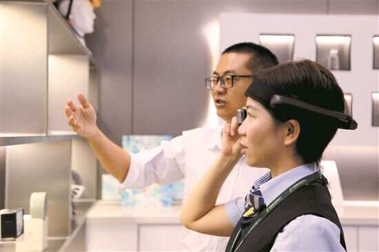 谷东科技技术人员为邮储银行广州市分行工作人员试用AR设备。