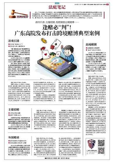 近日,广东省高级人民法院发布一批打击跨境赌博犯罪典型案例,主要包括依法严惩为境外赌博提供资金担保服务、结伙开设赌博网站、代理推广网络赌博平台或游戏、架设赌博网站中转平台、组织外围赌球等类型犯罪,体现了广东法院切实发挥审判职能作用,深入开展打击治理跨境赌博犯罪工作,依法从严从快准确惩处犯罪分子,守护国家安全、社会安定和人民安宁。据了解,近3年,广东全省法院共审结跨境赌博犯罪一审案件1369件2191人,共判处罚金1.13亿余元。