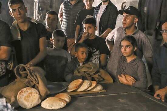 ■在加沙地带南部城市汗尤尼斯,人们排队等待买饼。 新华社发