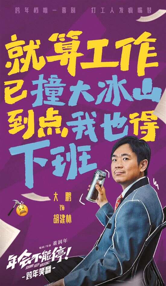 电影《年会不能停!》聚焦打工人生活,集结大鹏、白客、庄达菲、王迅、孙艺洲、李乃文等喜剧阵容,演绎一个够疯够爽的爆笑职场人故事。片中,大鹏化身底层钳工胡建林,一名耿直热诚的职场菜鸟,在裁员之际却被阴差阳错调入集团总部。从“工厂”到“大厂”,从“蓝领”变“金领”,胡建林因与大厂环境格格不入而笑料百出,也像一面“职场照妖镜”照出众生相。而白客出演裹挟在“错调”事件中的人事经理马杰,为保饭碗被迫为其周旋隐瞒。