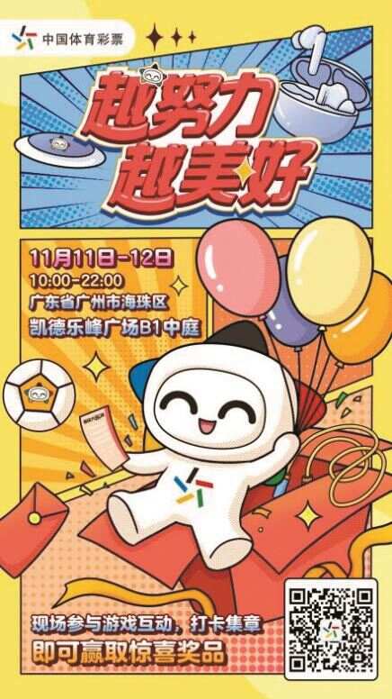 11月11日至12日,2023年广东体彩“越努力 越美好”嘉年华活动举行第二场,本场活动于广州市海珠区凯德乐峰广场B1中庭开展,现场参与游戏互动、打卡集章,即有机会赢取运动耳机、乐小星定制周边,以及“十倍幸运”体彩即开票或超级大乐透彩票。