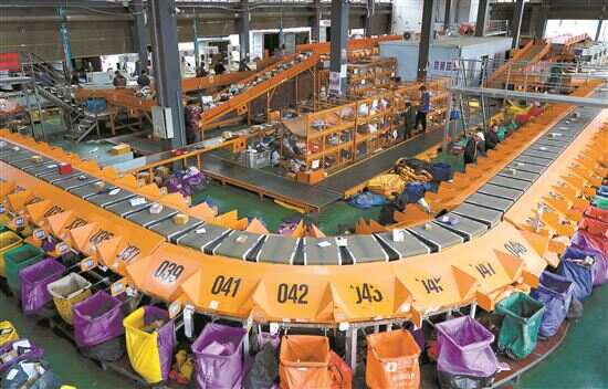■11月11日,在浙江省乐清市一家快递物流园,工作人员在流水线上忙碌。