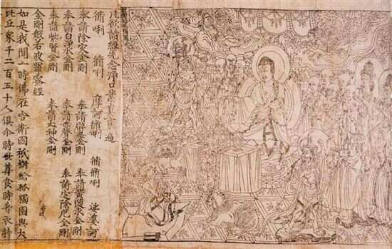 《金刚般若波罗蜜经》 唐 现藏英国伦敦图书馆,唐咸通九年(公元868年)印。卷首刻印说经图,图后为经文,是现存最早的雕版印刷品。据华东师范大学出版社