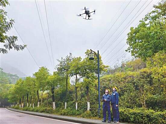 ■南方电网广东东莞供电局工作人员使用5G无人机对线路进行智能巡检。(徐靖琳/摄)