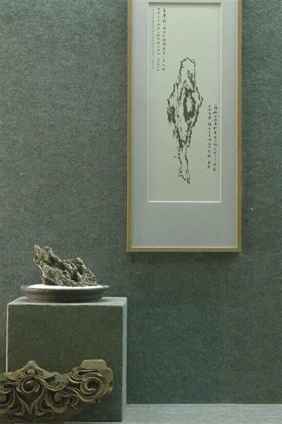 谷卿:九年前我去英德访石,晚间范白兄约我去他们的“同学社”小坐,屋里有张大桌和笔墨,茶余他笑着让我写点什么,我当时兴致也很高,随手画了一张英石图,题了倪元璐《文石图》的诗句,本来想着就是临场兴会之作,非常粗陋,他也不会留存。但去年刘释之兄在同学社拍了这张画的照片发给我,我几乎都不认识了,想了半天才记起来当时的情景,画上只是黑白两色,那天因为没带印章,画也一直没用印,显得光秃秃的,却被范白兄精心装框,一直挂在屋里。近日在广州万木草堂和英德市博物馆相继举办了范兄的藏石展和新书首发式,我看到他竟又将这件拙作搬到大庭广众之下献丑,实在羞愧,又很感动,因为我知道这是他在用这样一件物证,来记录我们和他与英石之间的缘分和情谊。
