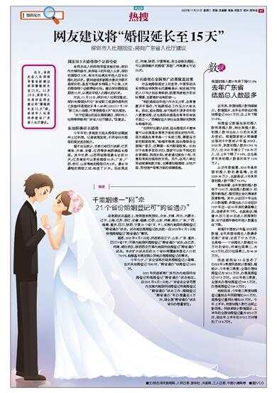 近日,有网友在人民网领导留言板建议深圳婚假延长至15天。11月18日,深圳市人社局回应网友建议将“婚假延长至15天”称,深圳市人社局将积极向广东省人社厅建议。