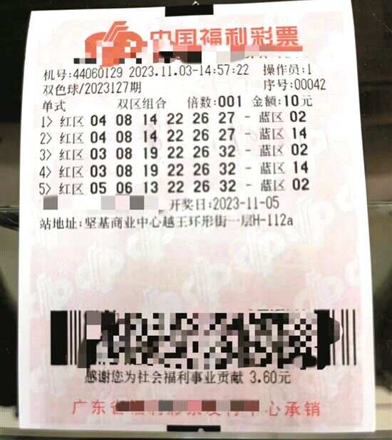 新快报讯 记者陆妍思 通讯员范莉报道 11月5日,福利彩票双色球第23127期开奖,河源市一彩民喜中双色球一等奖1注。中奖彩票售出自河源市坚基商业中心越王环形街一层的44060129销售站点,是一张金额为10元的5注单式投注票。值得一提的是,这张彩票不但中出了一等奖,票中另外一注投注号码也是红区全中,揽得二等奖1注,奖金合计701万多元。近日,幸运彩民曾先生(化姓)现身河源市福彩中心领走了属于他的701万元大奖。