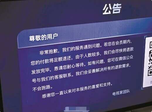 本周一晚,电视家官方表示,若用户在会员期内,此前付款将足额退还,尽快将退款发放完毕。其后有小部分用户表示已经收到了电视家的退款。