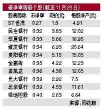 记者经统计,截至11月23日,A股市场破发股有779只,其中包括相对发行价破幅超50%的有70只,其中包括金科股份发行价为100元/股,(后复权)现价1.84元/股,股价跌幅超八成。金杯汽车和富通信息也是现价较发行价跌幅超八成。从破净股来看,截至目前,有345只个股股价低于每股净资产,破净率前十的个股中有6只是银行股,包括民生银行、华夏银行和浦发银行等均低于0.4倍,ST世茂市净率最低为0.27倍。