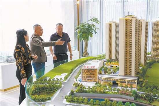 售楼大厅,进进出出的市民在销售人员指引下了解楼盘,不远处的工地里,每天有近200人在那务工,“物业等还有80人固定员工,基本上都是当地人。”向贤明说。
