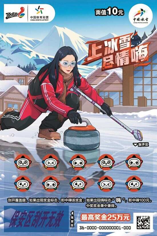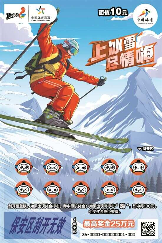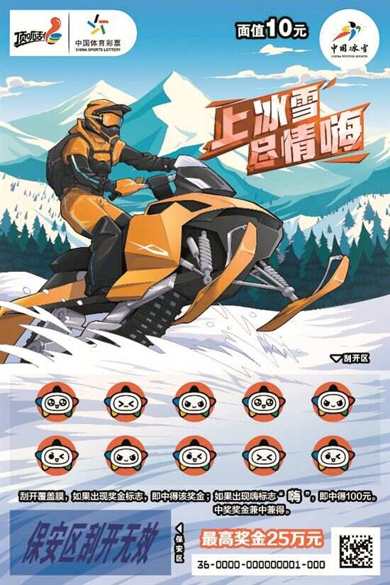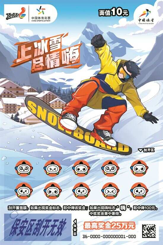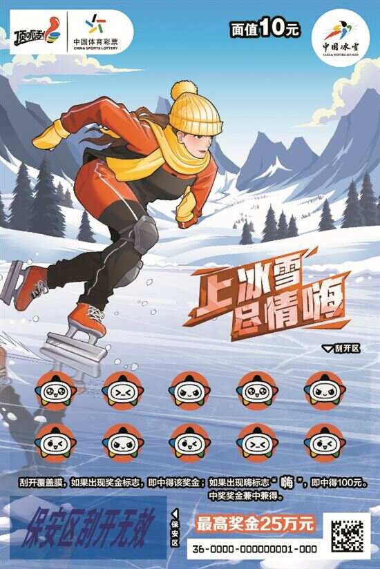 “上冰雪 尽情嗨”即开票面值10元,返奖率高达65%,最高奖金25万元。游戏规则:刮开覆盖膜,如果出现奖金标志,即中得该奖金。如果出现“嗨”标志,即中得100元,中奖奖金兼中兼得。