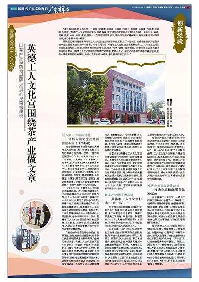 借助茶产业这个重要支点,2019年英德市总工会联络广东南华工商职业学院(广东工匠学院)与英德人才工作领导小组签订战略合作意向协议,以“一宫一品”为主线,茶产业学院为品牌,工人文化宫为主阵地开展各类服务职工、服务基层的人才培训、技能提升、学历提升等工作。“英德工人文化宫四楼的茶产业学院空间将建成招待区、产品展示区、茶艺展示区。”廖宇红表示,工人文化宫与茶产业学院两者相辅相成,将在未来推进茶产业及其他产业技能培训,为英德城市发展定位明确方向。