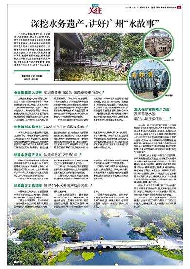 2023年1月,广州市印发广东首个、广州首批共计6个水务遗产名录(广州市黄龙带水库、西山堤围、南沙妈祖信俗、东濠涌、南越国木构水闸遗址、增埗水厂旧址),并按《指引》要求纳入广州市历史文化名城保护规划体系,及时扩大宣传,在中央、省、市级媒体进行多篇报道,有效增强岭南传统水文化的传播力和影响力,激发社会公众挖掘保护、继承发扬岭南水文化的热情,为全省挖掘保护、认定申报水务遗产树立“广州样本”。