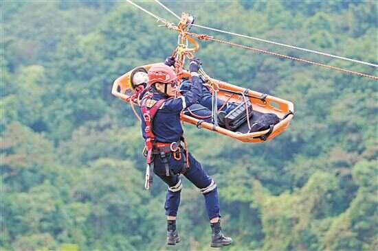 ■红棉老兵飞翔应急救援志愿服务队展示高空伤员担架转运。 新快报记者 郭思杰/摄