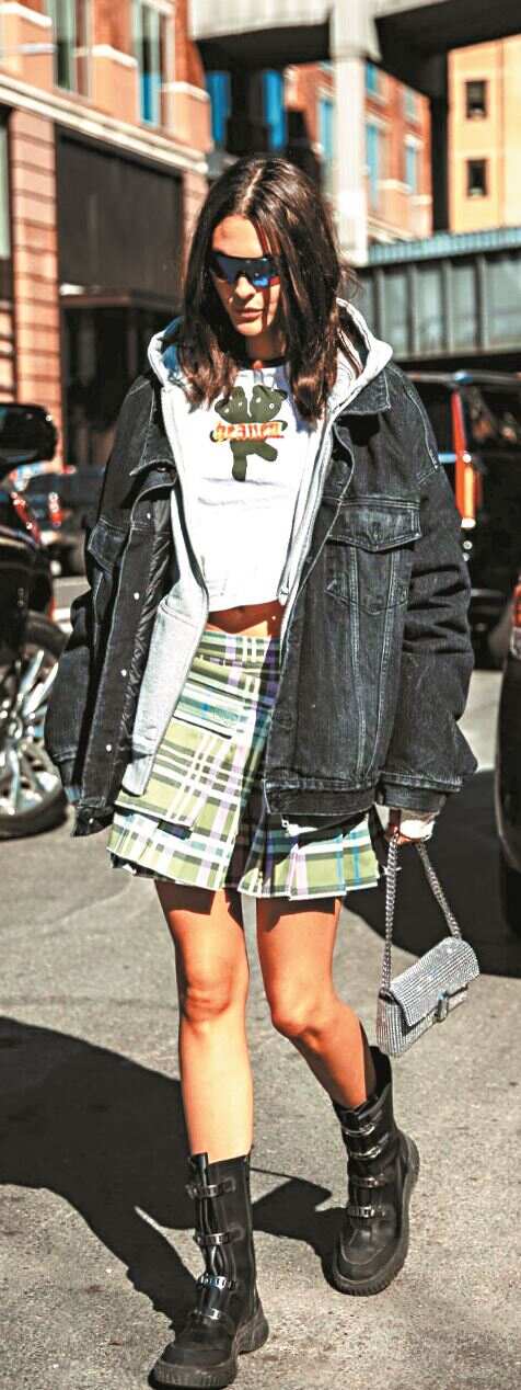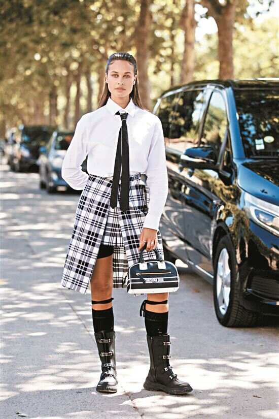 ■短款百褶裙学院气息更浓,在“非正式学院风”穿搭中出镜率也高,独特设计的细节也会影响百褶裙的风格,如将裙身中间做成一片式,褶子在两侧,显得更利落;错位式设计让褶子藏一半在裙身里,显得更街头和非正式。