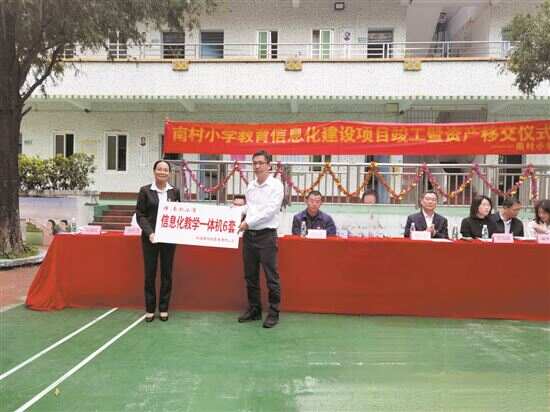 新快报讯 记者农艳芳 通讯员黄湛 张春林报道 “我们开展乡村振兴教育帮扶,为你们在学习上提供比较好的教育信息化平台,最大意义就是为了让你们享有城市学校一样的教学资源,听到全国最高水平的老师授课……”近日,珠海港集团党委副书记甄红伦一行6人到阳江市闸坡镇南村小学参加教育信息化项目竣工暨移交仪式,随着老师打开教学视频设备系统,向现场领导嘉宾解说了生动亮丽的课件画面,标志着南村小学教育信息化项目落成并投入使用。