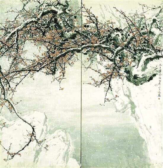 虽然在岭南少下雪,但不同年代以雪景为题材创作的作品,也有一些,著名画家关山月除了山水见长,梅花题材也家喻户晓,其中就不乏傲雪红梅的主题,例如《梅花雪里见精神》 《飞雪迎春到》。
