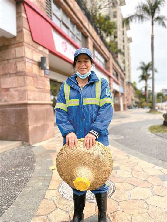 瘦瘦小小的吴妃妹,戴了一顶大斗笠,看上去“头重脚轻”。清晨6时,她已在天河区前进街的一个菜市场内躬身劳作,蔬菜档口堆着不少烂菜叶,生鲜摊位有被丢弃的不合格水产品……吴妃妹顺着走道七拐八拐,将这些垃圾全部扫进簸箕,倒入自己推着的流动垃圾箱。与街道保洁相比,打扫菜市场的任务稍显繁重,但她从不叫苦叫累。“工作很稳定,我已经干了3年多,非常珍惜这个工作。”吴妃妹爱笑,与记者聊起工作、家庭,都是一脸笑意,“我胆子小,从小不太敢跟陌生人说话,但在市场里,每位档主都跟我打招呼,像老朋友一样。”
