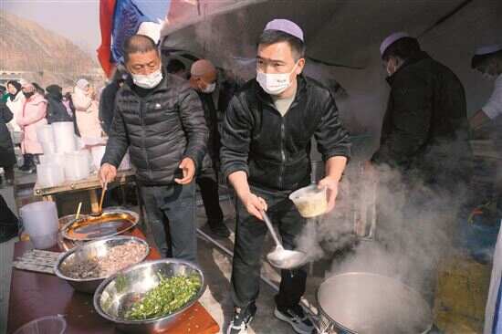 ■在积石山县大河家镇大河村安置点,爱心企业为受灾群众送来牛肉面。