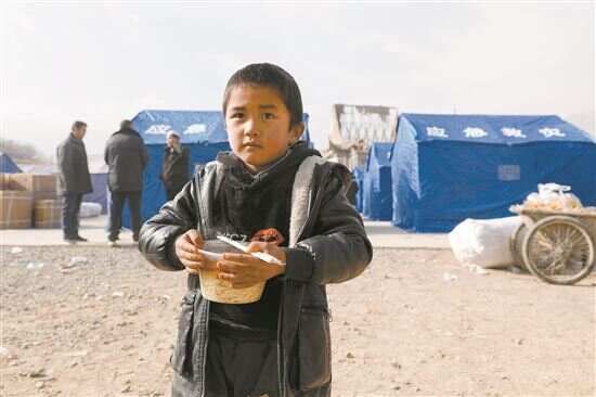■在甘肃临夏积石山县大河家镇大河村安置点,小朋友领取爱心牛肉面。