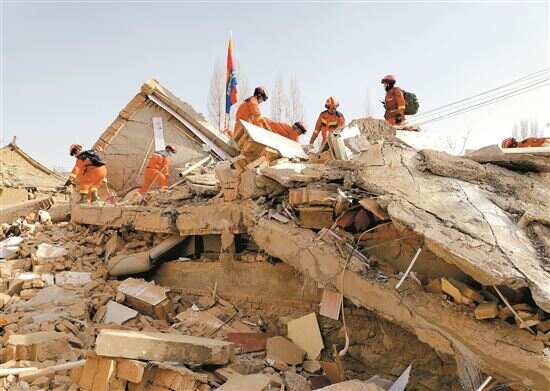■救援人员在甘肃省临夏州积石山县大河家镇进行救援。