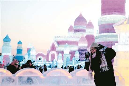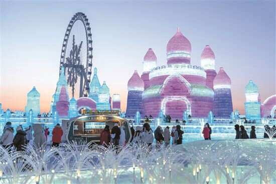 ■游客在哈尔滨冰雪大世界园区游玩。新华社发