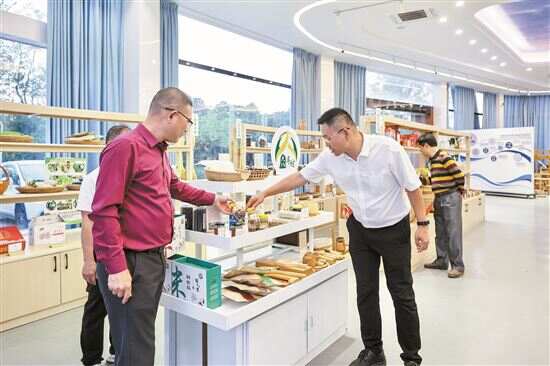 ■位于大八镇的阳东区农村电商产业园,木器加工制品、丝苗米、南药制品等阳东区优质农特产品在展示架上各放异彩。