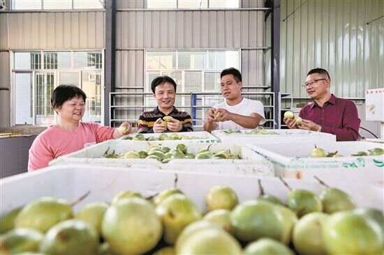 除了基础的种植养殖之外,周亨村正不断延伸特色种养产业链条,打造大米和酵素等加工厂以及香蕉集散中心、科技示范农场等二三产链条,“我们最大的优势就是土地,还是得专注做好‘农业芯片’。”梁启宗提到。目前,周亨村的种植养殖基地每天能吸纳300多人就业,村里有些上年岁的妇女也乐意每天到果园里采摘百香果,“有130元一天”。