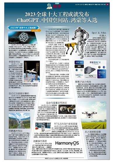 12月20日,由中国工程院院刊《Engineering》评选的 “2023全球十大工程成就”在京发布。本次评选出的成就包括:ChatGPT、中国空间站、百亿亿次超级计算机、白鹤滩水电站、双小行星重定向测试、RTS,S/AS01疟疾疫苗、鸿蒙操作系统、Spot & Atlas机器人、锂离子动力电池、无人驾驶航空器。