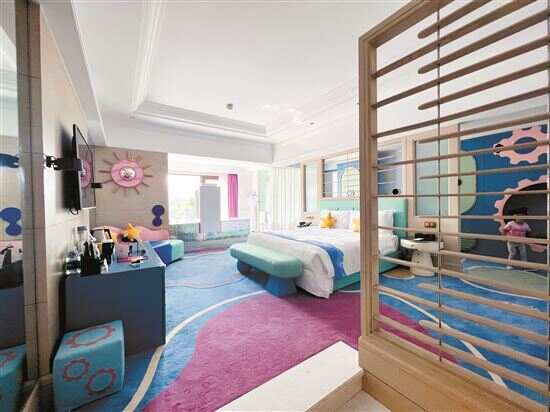 白天“放电”,晚上“安睡”,这是多少宝爸宝妈们对孩子出游一气呵成的期待。当然,酒店也考虑到这点,全新打造的海洋“深空舱室主题”亲子客房,以淡蓝湖绿色为基础色调,黄色海星抱枕点缀空间色彩,将海洋中的梦幻元素铺落在墙面及地毯上,让人一进门就仿若置身于大海之中。客房里还设有专属于孩子的“秘密空间”,里面迎接孩子的是超大熊娃娃的“爱的抱抱”,将亲子乐园里的快乐延伸到了晚安时光,让孩子枕着自己心目中的“奇趣乌托邦”甜甜睡去。