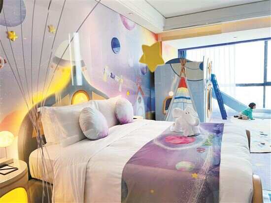 酒店里设有多种主题的亲子房,并配备了一定的儿童玩乐设备,让房间像游乐园一样好玩。当打开梦幻太空亲子客房时,小朋友第一时间便冲向带滑梯的双层床,在数次的爬上滑下中循环。畅快滑行之后,抱着房间里的太空人玩偶,开始寻找“宝藏”:地毯上的大型飞行棋、床头的太空人登月台灯、桌子上的太空拼图、能化身波波池的浴缸每一样都能让孩子兴奋地叫起来。