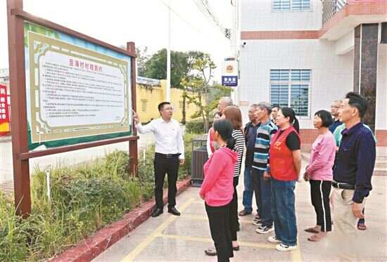 “提倡社会主义精神文明,喜事新办,不铺张浪费,丧事从俭,不搞陈规旧俗……”旦海村党群服务中心门前的宣传栏上写满了一条条清晰到位的村规民约,驻树仔镇工作队队员、驻旦海村第一书记尚尔东正在认真给村民讲解移风易俗知识,引导村民正确看待村规民约。