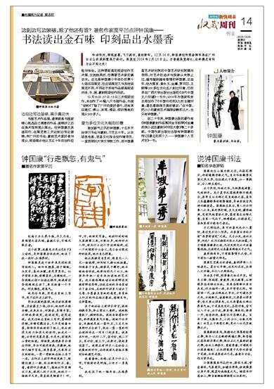 敢创新气之风的钟国康,十五岁开始学习书法与篆刻,习艺五十年。从农场放电影,到县文化馆当创作辅导员,一直到深圳大学文学院工作,到中国最高艺术研究院的中国艺术研究院聘为导师,对艺术的追求与探索从未停止过,越写越刻越有激情的钟国康,这些年,他为莫言、黄永玉、金庸、贾平凹、王朔等200多位文化名人刻过印章,已收录在广西大学出版社出版的《当代中国文人印谱》一书中;2014年为国家税务总局创作了《中国印花税》九枚主题印章;著名喜剧演员黄宏曾说:“在中国,把小小的篆刻艺术搞得动静那么大,也只有钟国康。”