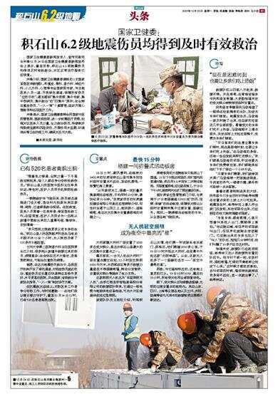据悉,在这次地震伤员救治中,各级医疗机构开设了绿色通道,对轻症伤员就近收治,重症伤员经处置后快速转运至条件更好、水平更高的医院,并由国家、省级救治专家驻点指导,“一人一策”制定诊疗方案。