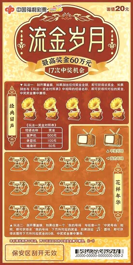 “流金岁月”面值20元,共有17次中奖机会,最高奖金60万元。共有两个玩法:“经典留声”和“花样年华”;两个玩法区内的中奖奖金兼中兼得。