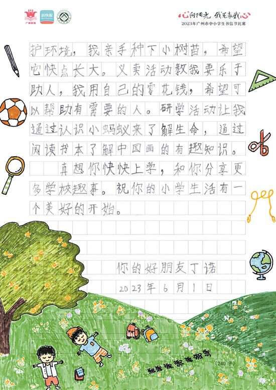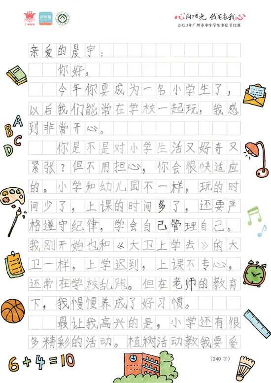 来自广州市越秀区小北路小学的丁诺同学以作品《我的小学生活》,获得了本次比赛小学低年级组一等奖。虽然写下这封信时,他只是一名一年级的“小萌娃”,但他却十分懂事地察觉到了好友晨宇在即将升入小学前的好奇和紧张。借书信节比赛的机会,他向晨宇热情地介绍自己的小学生活,为好朋友送上真诚的祝福和鼓励,帮助他完成从幼儿到小学生的转变。