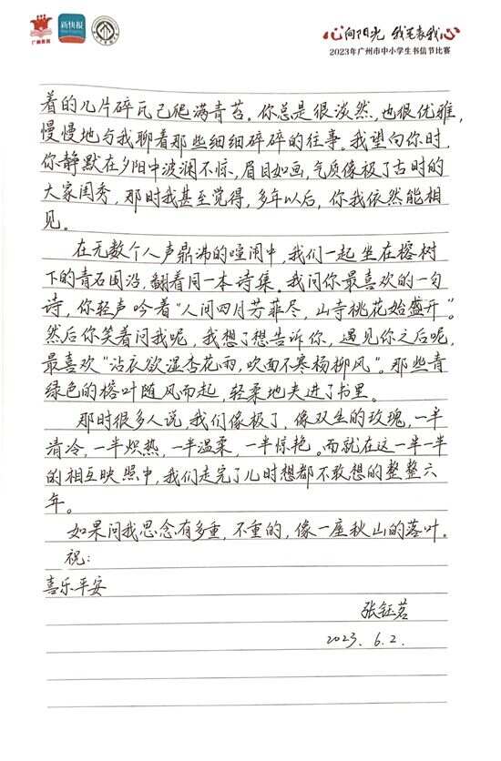 存入书信的友情,如初春时的浓茶,愈久愈醇、时有回甘,让人失意时从中汲取前行的力量,得意时有人分享灵魂的欢愉。记者留意到,本次由广州市教育局主办,共青团广州市教育局委员会、广东新快报社和广州市艺术中学联合承办的以“心向阳光·我笔表我心——2023年广州市中小学生书信节比赛”获奖作品中,许多中小学生写下了和朋友的故事,她们笔触稚嫩,但情感真挚动人、充满童真童趣和积极向上的力量,给人以温暖。