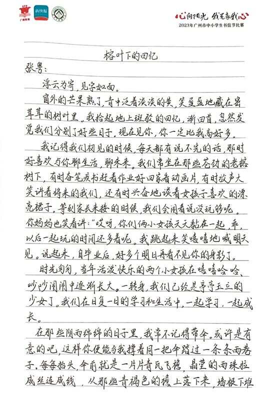 “这次能获奖,我觉得很惊喜,谢谢老师平时对我们写作的重视和指导。”广州开发区中学张钰茗同学的作品《榕树下的回忆》,在此次比赛中获得初中组一等奖。开心之余,她也决定将这封信寄出,和此次写信的对象——好友张粤分享这个好消息。
