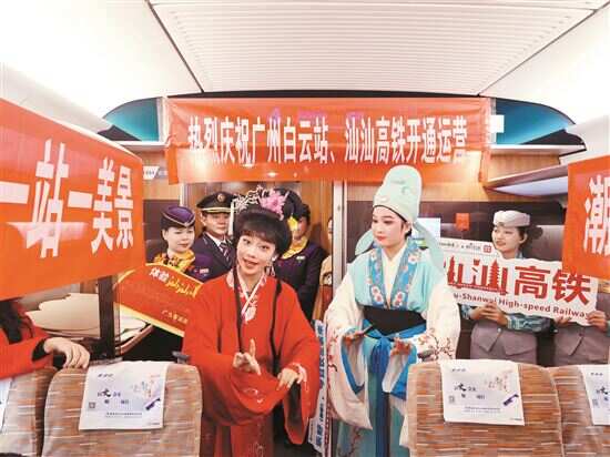 值得一提的是,结合粤东旅客品茶的喜好,首发车现场还冲泡粤东著名的单枞茶供旅客品尝体验。为庆祝高铁开通,列车上还专门安排了潮剧表演。
